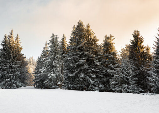 Paysage de sapins recouverts de neige en montagne, manteau blanc de neige au sol au premier plan et rayons de soleil éclairant la cime des sapins, ciel orangé de fin de journée