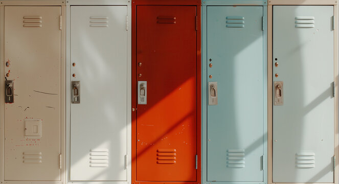 Young attractive woman wearing grey sweater opening metal locker door, rack of lockers stacked