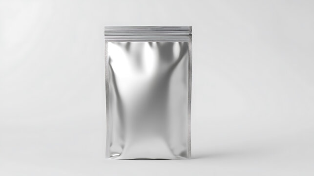 Shiny, silver, pouch with a zipper closure and wrinkled surface, on black backdrop