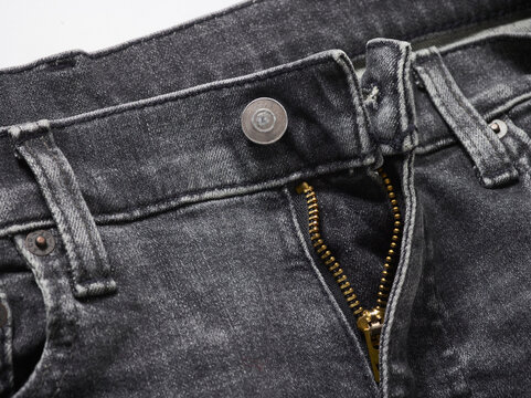 Close-up of black denim jeans with a partially open gold zipper and buttoned waistband.