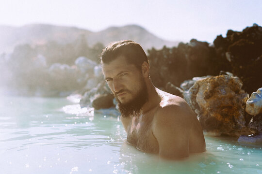 Man relaxing in hot spring Blue Lagoon, Iceland.
