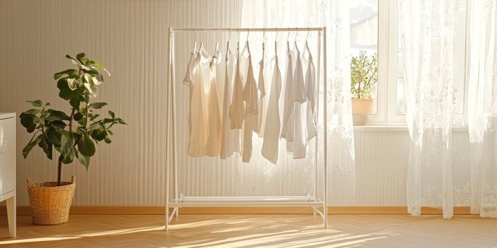 Apparel warehouse with clothes hanging on racks. Fashion apparel distribution hub for new, used clothing. Storage, textile retail, inventory. Wholesale delivery organization, garment style. Colors,