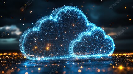 Abstract digital cloud computing network with glowing lines and nodes