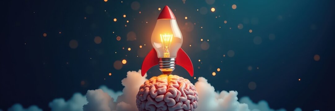 A creative and imaginative illustration showcasing a brain forming the base for a rocket ship-shaped lightbulb, symbolizing innovation, idea generation, and the process of creative thinking with a...