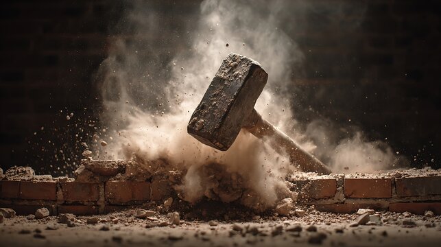 Close-up of a sledgehammer smashing a brick wall, creating a cloud of dust