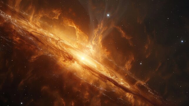 Glowing interstellar nebula stretching across cosmos with dust lanes and star clusters