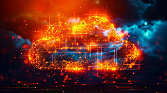 A digital cloud concept glowing with bright orange energy and data connections representing technology innovation and futuristic networks