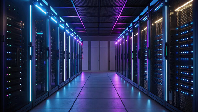 Data center servers with glowing neon lights. Cyber space with digital data servers. Modern tech concept shows infrastructure for storing processing info. Futuristic data center room with server