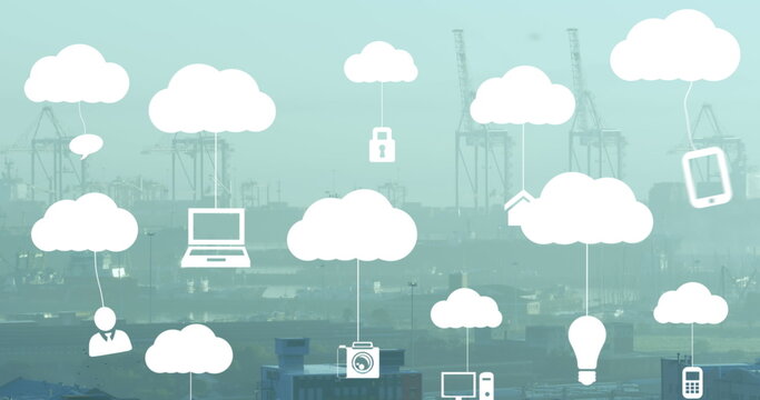 Cloud computing symbol with connected devices over cityscape background representing modern technology and data network concept in light style.