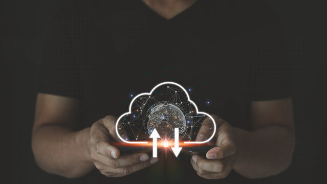 Technology and data information transfer concept. Man holding mobile phone which on the top of phone has upload and download cloud space, Exchange data with internet cloud technology. Cyber security.