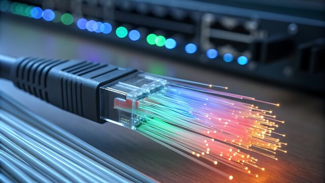 Fiber optic cable transmitting data with vibrant light, representing high-speed internet and modern technology solutions