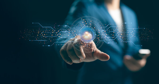Cloud or edge computing technology concept. Businessman uses finger to click cloud icon connects data access Global use abstract binary code on dark blue background.