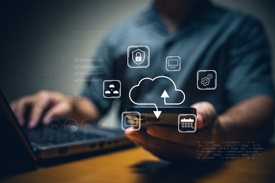 Cloud data synchronization concept. A person using a smartphone and laptop with cloud storage icons, security, settings, calendar, and folders overlaid, representing digital connectivity.