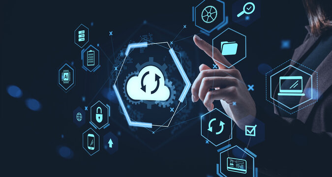 Cloud backup service concept with hand interacting with holographic digital interface icons on dark background representing storage and data management.