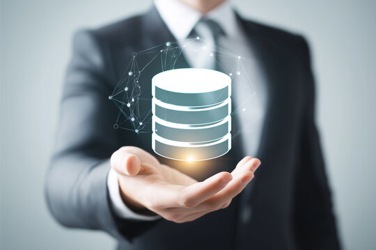 "Business professional holding glowing cloud icons symbolizing cloud computing digital data storage modern technology and online network solutions"