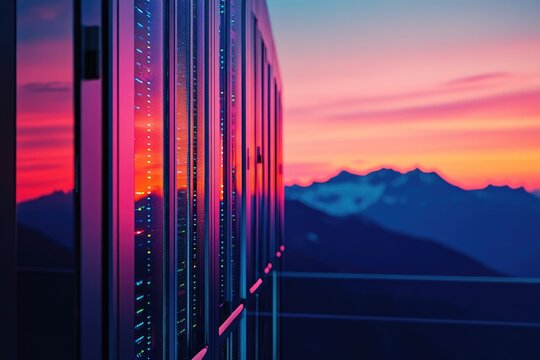 Data center server racks reflecting a vibrant sunset over majestic mountains.