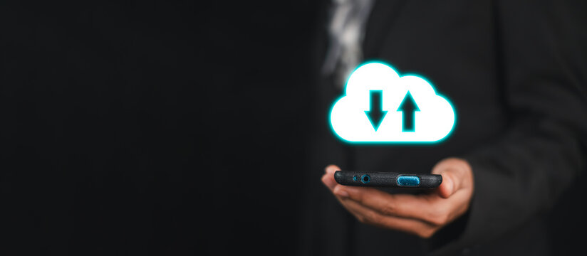 Cloud computing concept, Businesswoman using smartphone with icon cloud computing network and icon connection data information in hand. Cloud computing and technology concept.