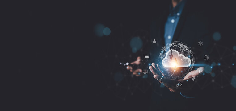 Businessman working financial trading and digital marketing with a cloud computing on modern virtual interface, cyber security, innovation and technology on dark background.