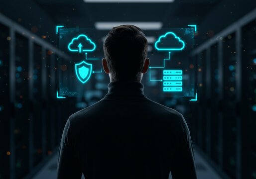 Futuristic cloud computing concept with a holographic cloud and data streams in a high-tech data center