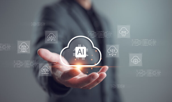 Close-up of a hand using cloud computing digital interface on tablet, with icons of AI, data analytics, and connectivity, concept of modern business technology and innovation.