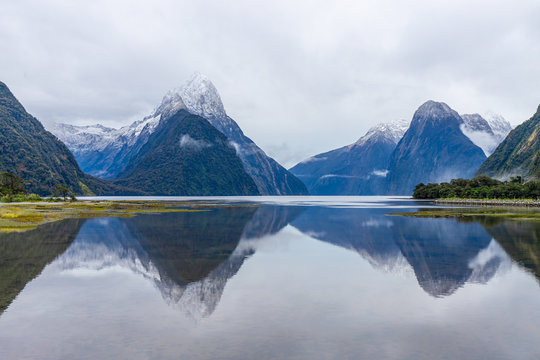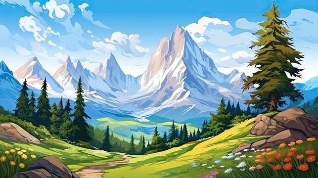 The majestic mountain landscape is a sight to behold. The towering peaks are covered in snow. The lush green valley is filled with wildflowers.