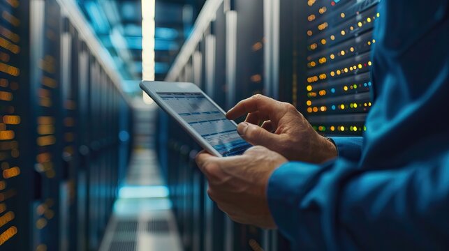 A female technician monitors server performance with a tablet in a data center