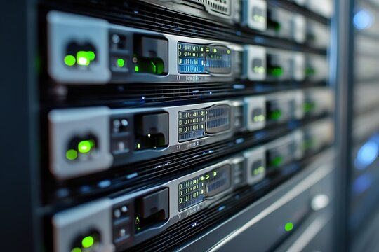 A close-up view of data center server racks featuring active status lights and ventilation panels.