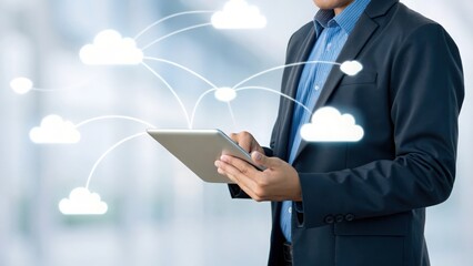 Man using smartphone with cloud computing icon. Internet technology and networking concept.