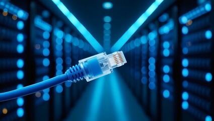 a network cable connection with data center server room in the background