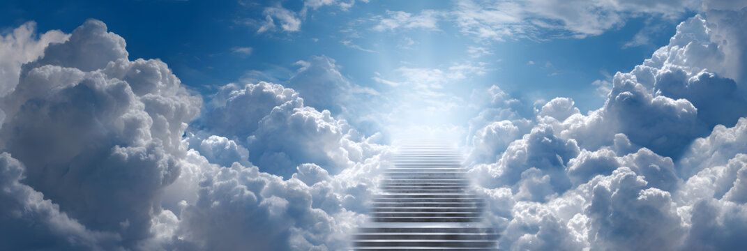 Stairs to heaven in beautiful blue sky. Stairway through the clouds leading to heavenly light. Heavens gate. After life concept in christian religion