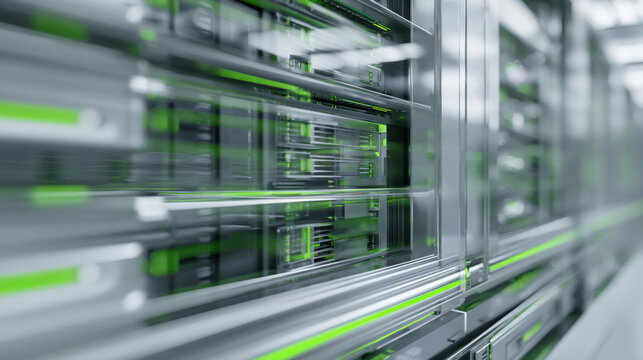 modern data center with glowing green elements, representing speed, advanced technology, and cloud infrastructure