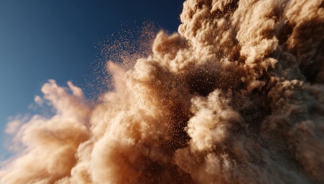 A dynamic explosion of brown powder against a vibrant blue sky, particles airborne