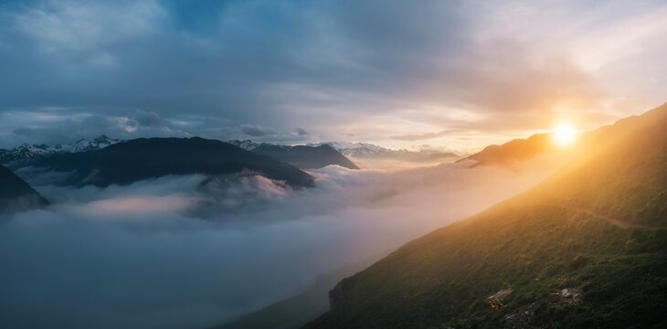 Panoramic view of a sea of clouds below the mountains during a sunset. Vall d'Aran, catalonia, Spain