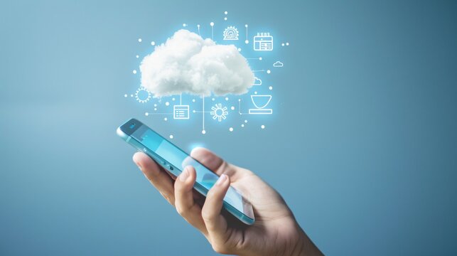 Secure Cloud Computing: Hand Holding a Smartphone with Holographic Cloud Icons, Depicting the Integration of Mobile Technology and Cloud Services with Blue Background - Generative AI