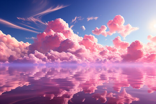 Pink liquid reflecting white cumulus clouds with rippling surface and shimmer