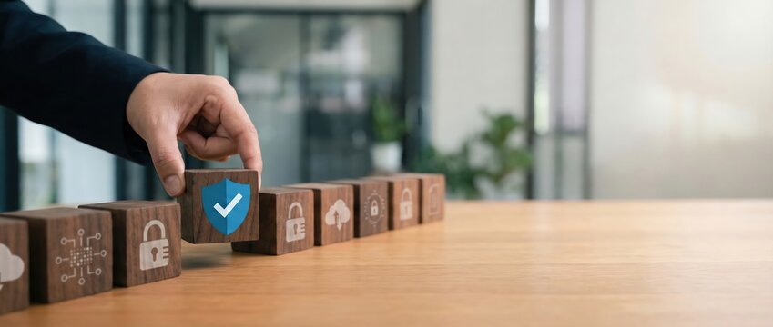 Businessman updating cloud security settings with shield and lock icons in a futuristic digital environment, symbolizing data protection and modern technology solutions