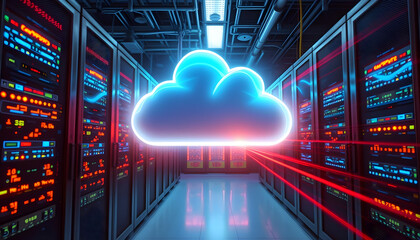 Dynamic cloud computing servers syncing data with brilliant neon glow in a modern data center for cutting edge technology solutions