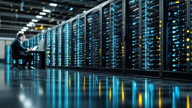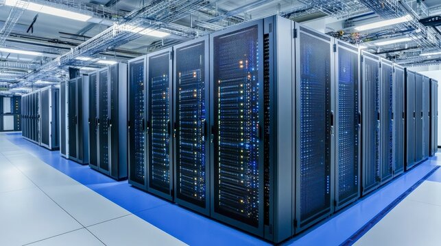 Modern data center with rows of server racks and LED indicators