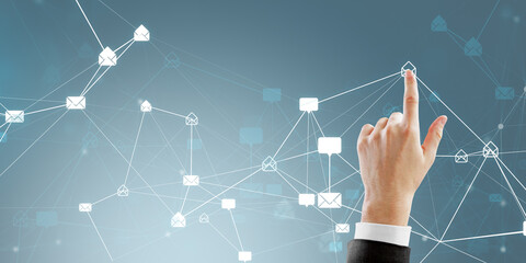 Hand selecting email icon on digital interface with network connections in abstract virtual background.