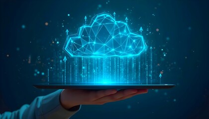Cloud computing technology concept hand holding digital tablet with cloud data storage network