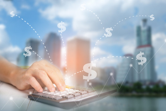 Hands typing on a laptop keyboard with overlaid skyscrapers and bar charts, on a white background. Concept of modern business, finance, and technology