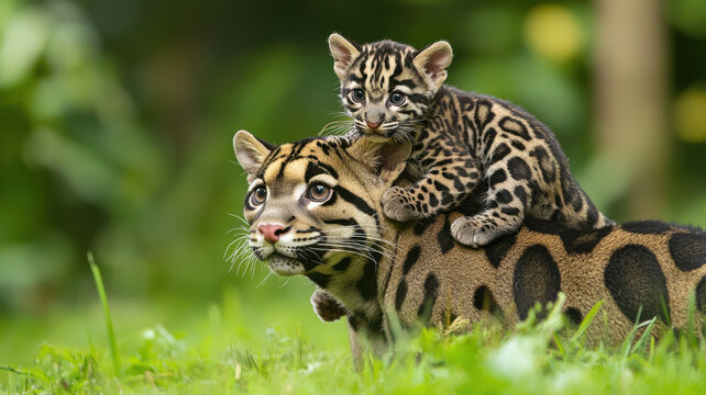 A playful baby clouded leopard climbs onto its father’s back, gripping his fluffy fur with tiny paws as he stands calmly in a sunlit field of green grass and swaying wildflowers.
