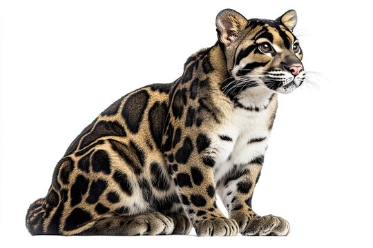 Majestic adult clouded leopard neofelis nebulosa in its natural habitat, showcasing its striking coat with dark cloud-like markings, ears perked up, eyes alert.