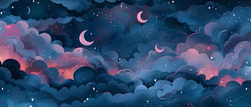 Whimsical watercolor illustration of a glowing crescent moon surrounded by fluffy clouds and twinkling stars on a white background