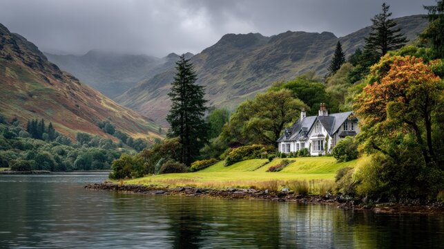 A white house rests on the shoreline of a Loch in the Scottish Highlands. Mountains are in the distance under a cloudy sky, and trees surround the house