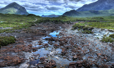 Dreamy rainbow arches over the mountainous countryside during a cloudy day, brightening the landscape with its vibrant colors