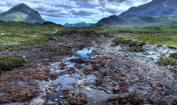 Misty Mountainside Grassy Slopes and Rocks Landscape