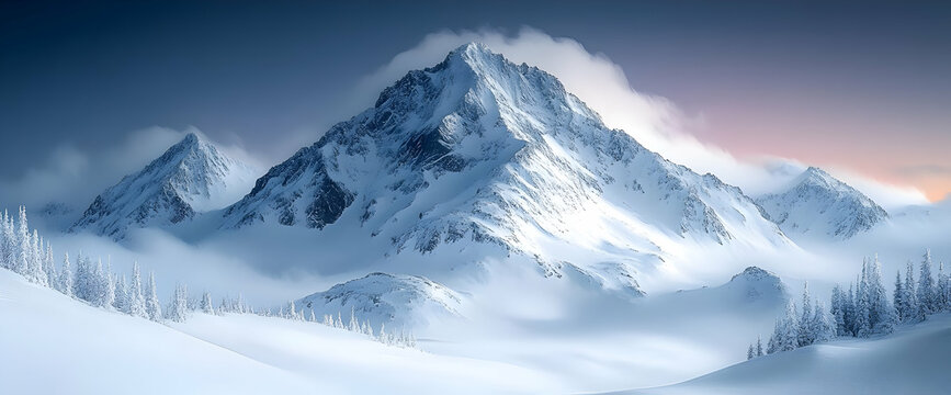 Misty sunrise over snowy mountain peak