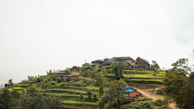 Mountain peak with houses on a cloudy day