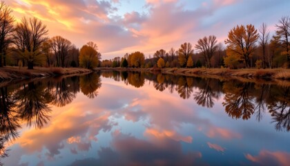 reflection of cloudy orange sky on still water, framed by warm toned trees, autumn setting